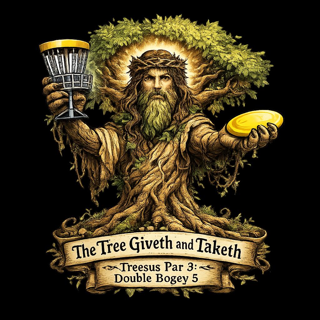 This āTreesusā disc golf shirt is for players who know the trees always win. Whether itās a perfect line turned into a bad kick or hitting the same tree twice, this design captures one of the most legendary inside jokes in disc golf.